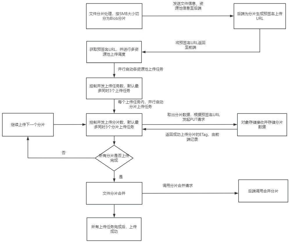 1.文件分片处理:将文件按 5MB 大小切分为多个 Blob 分片,并发送文件信息至后端。
