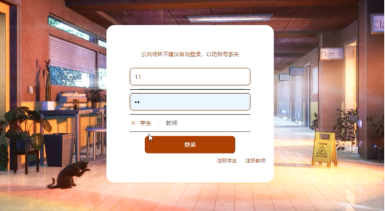 学生在登录时需输入正确的登录用户名和密码,系统会以登录用户名、密码为参数进行登录信息的验证,信息正确则登录成功,反之登录失败,学生登录界面展示如图所示。