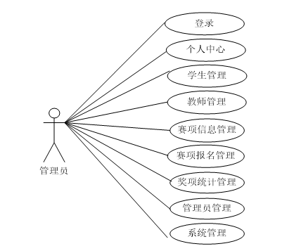 管理员:管理员登陆后可对系统进行全面管理,管理员主要功能模块包括个人中心、学生管理、教师管理、赛项信息管理、赛项报名管理、奖项统计管理、管理员管理以及系统管理,管理员实现了对系统信息的查看、添加、修改和删除的功能。