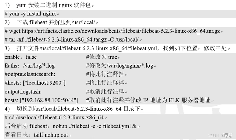 output.logstash:hosts: ["192.168.137.138:5044"] # ELK 服务器的 Logstash 端口(需确保 Logstash 已配置 5044 端口接收 Filebeat 数据)