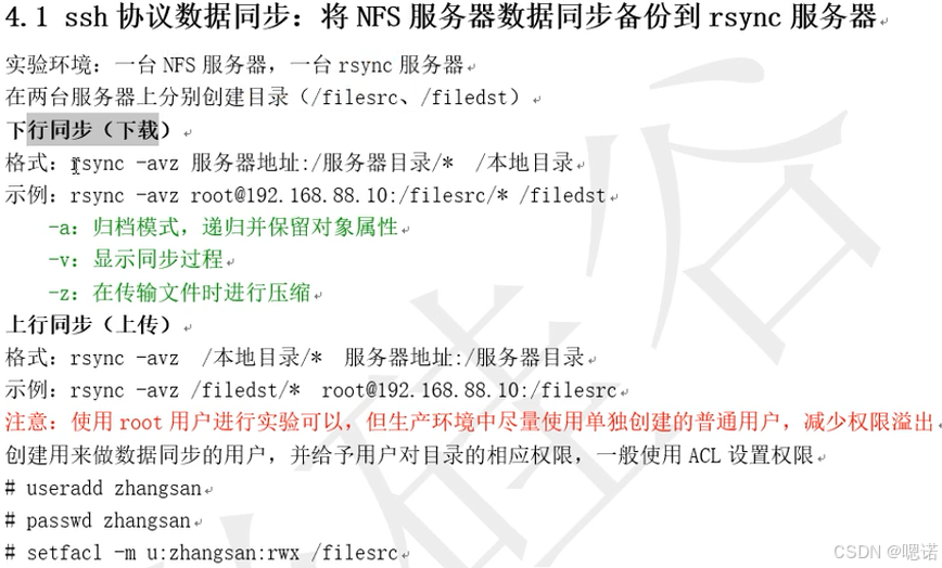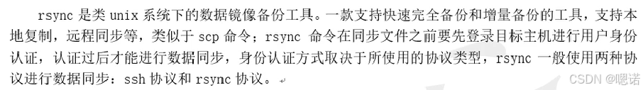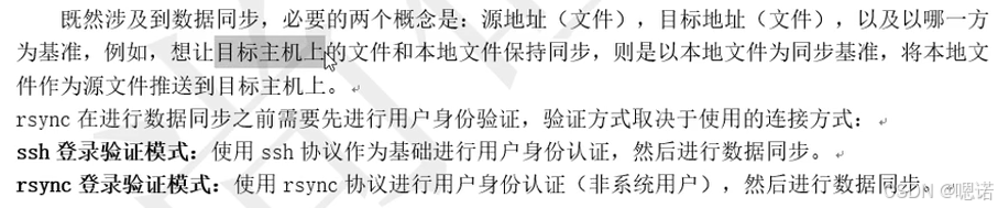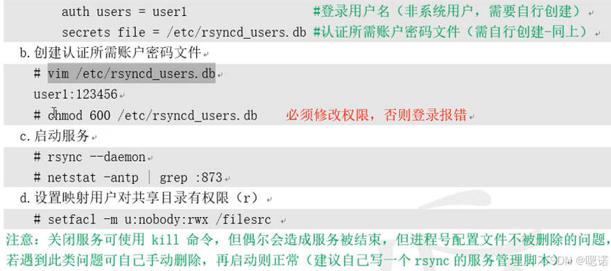 认证用户(服务端):# 创建虚拟用户 user1(非系统用户,仅用于 rsync 认证) echo "user1:123456" > /etc/rsyncd_users.db # 修改密码文件权限(必须为 600,否则认证失败) chmod 600 /etc/rsyncd_users.db