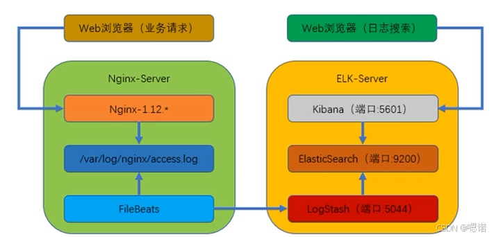 - Filebeat:轻量级日志采集器,监控 Nginx 日志文件,将日志发送到 ELK(Elasticsearch + Logstash + Kibana)。