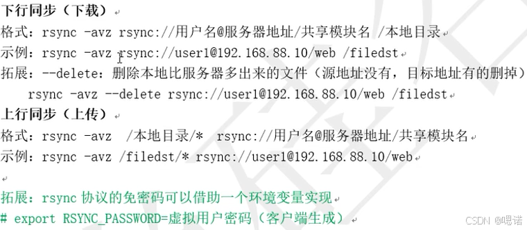 rsync -avz --delete rsync://user1@192.168.88.10/web /filedst