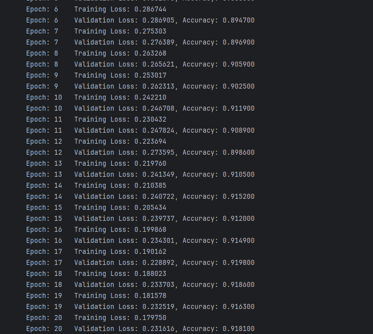 def train(epoch):model.train()#1.设置模型为训练模式train_loss = 0#2.初始化训练损失for data, label in train_loader:data, label = data.cuda(), label.cuda()#3.将数据和标签移到GPUoptimizer.zero_grad()#4.梯度清零output = model(data)#5.前向传播loss = criterion(output, label)#6.计算损失loss.backward()#7.反向传播optimizer.step()#8.更新参数train_loss += loss.item()*data.size(0)#9.累计训练损失train_loss = train_loss/len(train_loader.dataset)#10.计算所有伦次数据平均训练损失print('Epoch: {} \tTraining Loss: {:.6f}'.format(epoch, train_loss))def val(epoch):model.eval()#1.设置模型为评估模式val_loss = 0#2.初始化评估损失gt_labels = []#初始化真实标签列表pred_labels = []#初始化预测标签列表with torch.no_grad():for data, label in test_loader:data, label = data.cuda(), label.cuda()#3.将数据和标签移到GPUoutput = model(data)#4.前向传播preds = torch.argmax(output, 1)#5.获取预测结果,argmax返回最大值索引gt_labels.append(label.cpu().data.numpy())#6.将标签移回CPU并转换为numpy格式pred_labels.append(preds.cpu().data.numpy())#7.将预测结果移回CPU并转换为numpy格式loss = criterion(output, label)#8.计算损失val_loss += loss.item()*data.size(0)#9.累计评估损失val_loss = val_loss/len(test_loader.dataset)#10.计算所有伦次数据平均评估损失,test_loader.dataset=数据集的大小gt_labels, pred_labels = np.concatenate(gt_labels), np.concatenate(pred_labels)#11.将列表转换为numpy格式acc = np.sum(gt_labels==pred_labels)/len(pred_labels)#12.计算准确率print('Epoch: {} \tValidation Loss: {:.6f}, Accuracy: {:6f}'.format(epoch, val_loss, acc))for epoch in range(1, epochs+1):train(epoch)val(epoch)