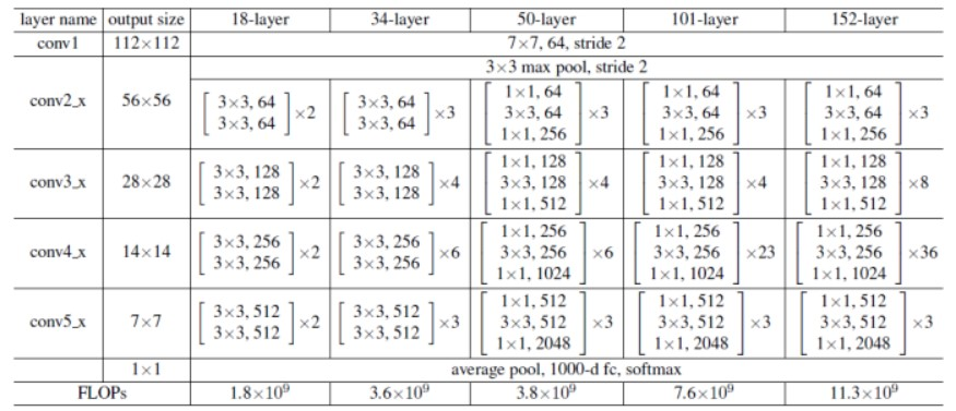 ResNet常见的大小有下图的ResNet-18,ResNet-34,ResNet-50、ResNet-101和ResNet-152,其中网络后面的数字代表的是网络的层数。