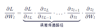 对于一个深层网络,损失函数 L 对某一层参数 Wl 的梯度为: