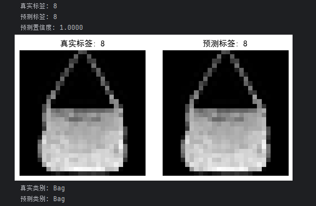 class_names = ['T-shirt/top', 'Trouser', 'Pullover', 'Dress', 'Coat','Sandal', 'Shirt', 'Sneaker', 'Bag', 'Ankle boot']print(f"真实类别: {class_names[true_label_cpu]}")