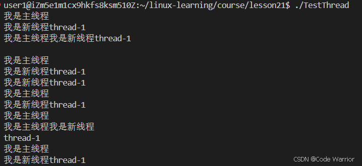 {pthread_t tid;int n = pthread_create(&tid, nullptr, threadrun, (void*)"thread-1");if(n != 0){std::cout << "pthread_create error" << std::endl;return 1;}while(1){std::cout << "我是主线程" << std::endl;sleep(1);}return 0;