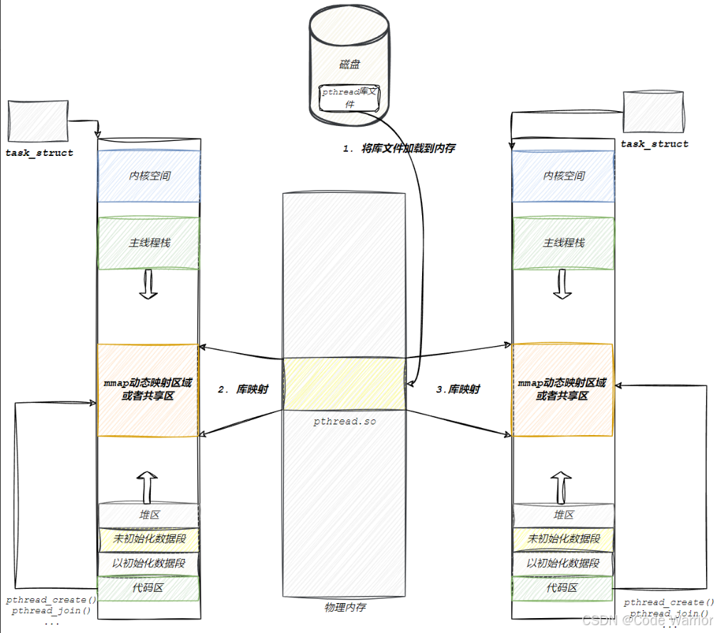 - 其他线程:栈由 pthread 库在共享库区域与堆之间动态分配(独立于主线程栈),保证线程栈的私有性。