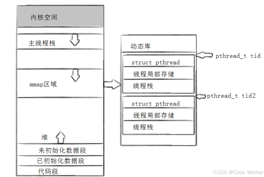 - 主线程:栈位于进程地址空间的传统栈区(低地址附近),与进程的栈共享同一片区域。