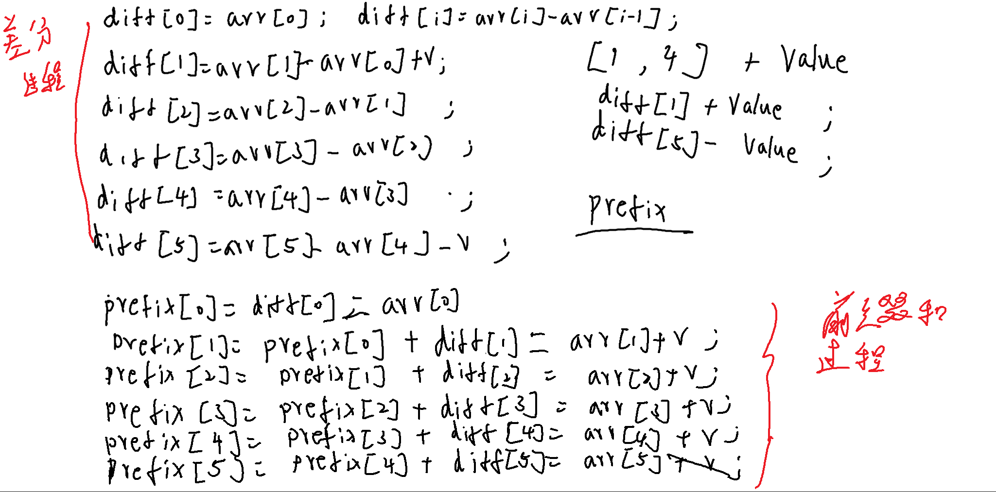 我们现在给定一个arr[0,0,0,0,0,0],如果先我要给1,3区间都加上1,那我们是不是要遍历一遍,然后给这些范围都加上1,但擦还分就是让你在1这个地方加1,4这个地方-1,然后我们进行求前缀和,得到的就变成arr[0,1,1,1,0,0],这就是差分的高效性