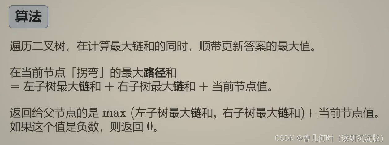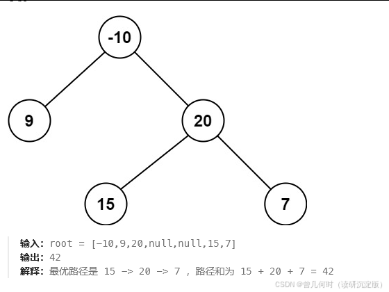 public:int res = INT_MIN; 用来维护最大值int dfs(TreeNode* root){if(root == nullptr)return 0;int left = dfs(root->left);int right = dfs(root->right);// 维护最大值res = max(res, left + right + root->val);res = max(res, root->val);res = max(res, left+root->val);res = max(res, right+root->val);// 返回单支树中最优路径和int r1 = root->val;int r2 = left+root->val;int r3 = right+root->val;int mx = max(max(r1, r2), r3);return mx;}int maxPathSum(TreeNode* root) {dfs(root);return res;}