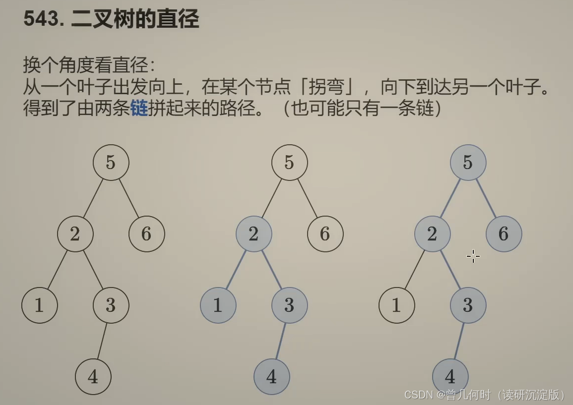 public:int res = 0;int dfs(TreeNode* root){if(root == nullptr)return 0;int left = dfs(root->left);int right = dfs(root->right);res = max(res, left + right);// return left > right ? left+1 : right+1;return max(left, right)+1;}int diameterOfBinaryTree(TreeNode* root) {dfs(root);return res;}