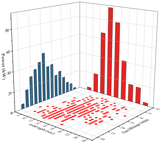 3D 坐标下边际直方图是一种将三维数据分布与其一维边际分布同时展示的可视化图形。主图部分为三维直方图,用于展示变量 X、Y、Z 之间的联合分布情况;在其底部的两个平面上,分别附加了 X 方向与 Y 方向的边际直方图,用以反映各变量在单独维度上的分布特征。
