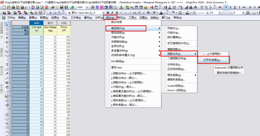 4.回到表格中,计算X、Y的频数分布;选中X列,点击统计—描述统计—频数分布—打开对话框;