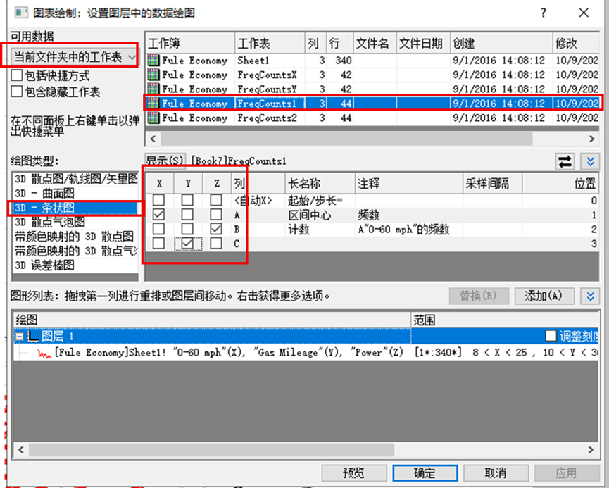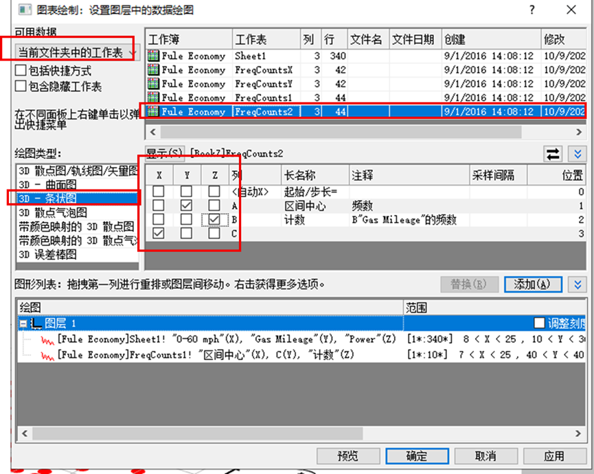 6.回到图形中,点击图—图表绘制,在跳出的对话框中,设置可用数据为在当前文件夹中的工作表,然后在顶部面板选择Fule Economy FreqCounts1工作表。 在中间面板选择绘图类型为3D 条状图,然后设区间中心为X,添加列为Y,计数为Z,然后点击添加按钮。同样地,在顶部面板选择Fule Economy FreqCounts2工作表。 在中间面板选择绘图类型为3D 条状图,然后设添加列为X,区间中心为Y,计数为Z,然后点击添加按钮。