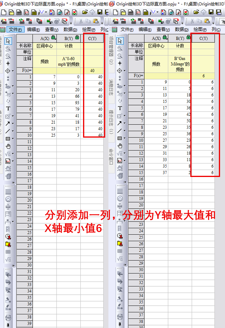 5.分别对表格进行整理,分别添加一列,分别为3D散点图中Y轴最大值40和X轴最小值6;