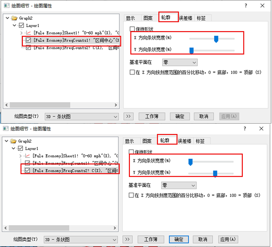 7.双击柱状图,打开绘图细节对话框。 对于X, 在轮廓选项卡,设置X方向条形宽度为60, 且Y方向条形宽度为0。 对于Y, 在轮廓选项卡,设置X方向条形宽度为0, 且X方向条形宽度为60。点击确认。
