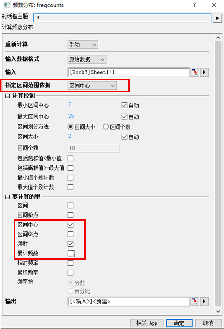 在跳出的对话框下,将指定区间范围依据为区间中心,要计算的量选择区间中心和频数即可。同样地,对Y列进行同样地操作;