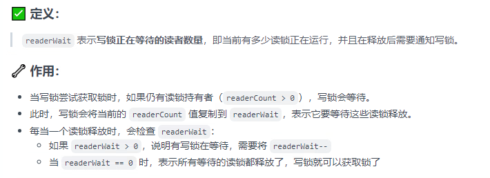 4)每个释放的读锁会将 readerWait--,当 readerWait 归零时唤醒写锁。