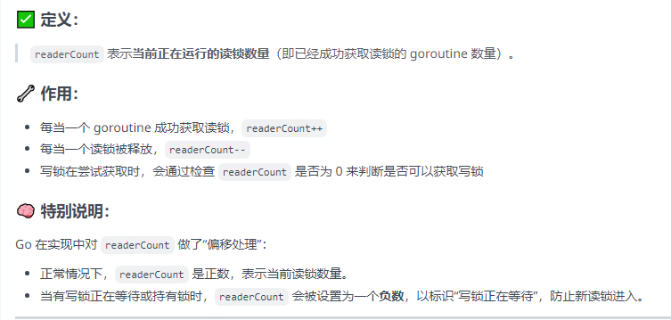 1)将 readerCount 减去一个极大值(rwmutexMaxReaders)使其变为负数,阻止新读锁进入