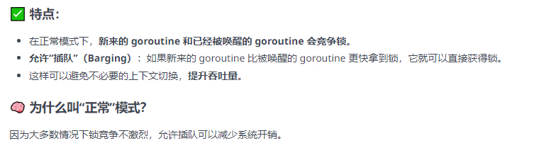 在正常模式下,则是新请求锁的goroutine更容易获取锁,为什么呢?可以联想到资源占用,新请求的goroutine正在cpu上运行,占用着cpu资源,更容易抢锁成功。