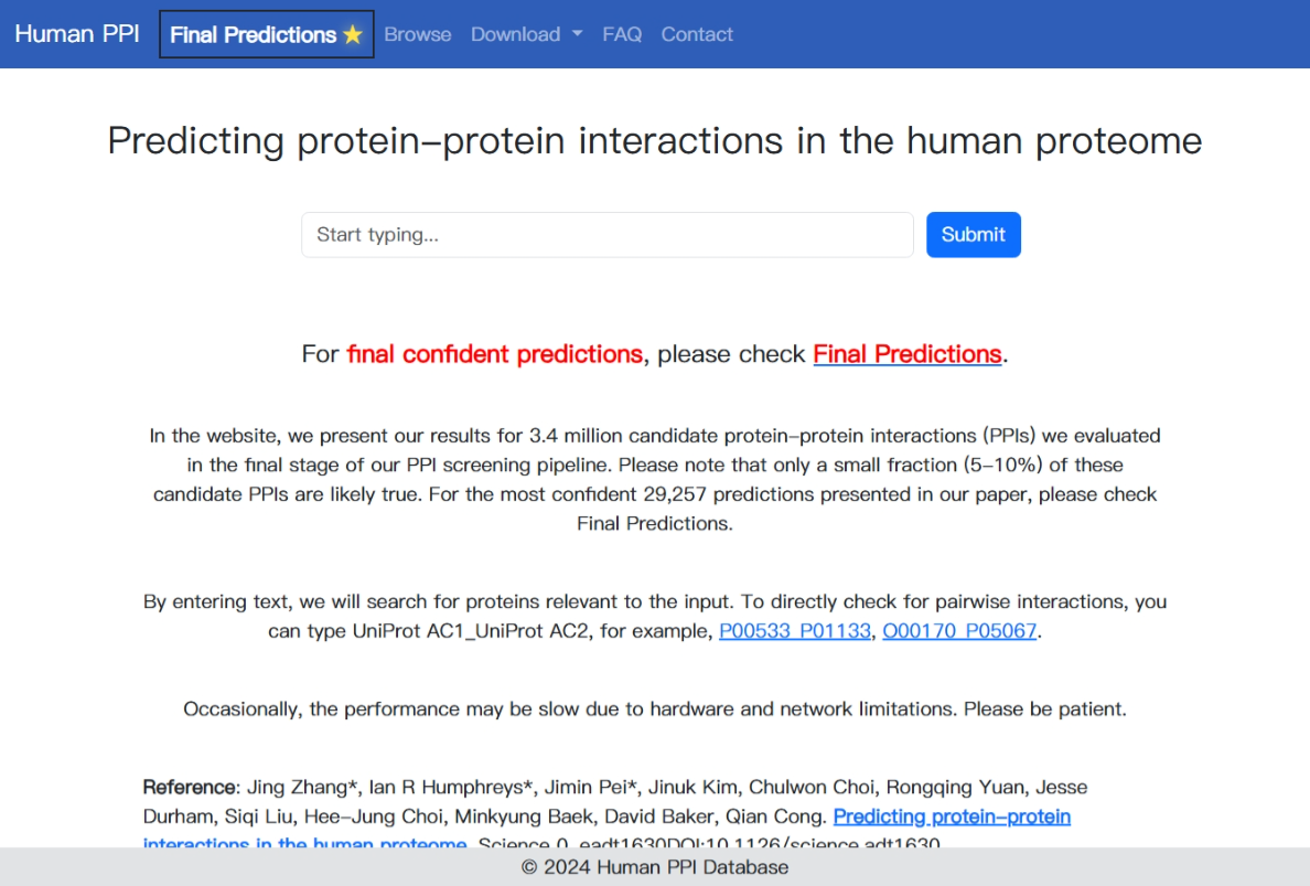 在网站上,展示了在 PPI 筛选流程的最后阶段评估的 340 万个候选蛋白质-蛋白质相互作用 (PPI) 的结果。请注意,这些候选 PPI 中只有一小部分 (5-10%) 可能是正确的。有关作者论文中最有信心的 29,257 个预测,请查看最终预测选项卡。