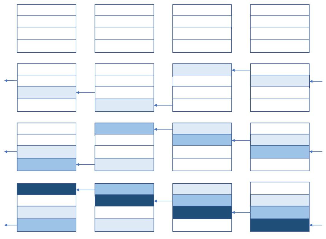 在第 1 步中,每个设备都负责某一块 V/p的数据并向左边的设备发送这块数据,譬如在图 3 中,第 1 个设备负责第 2 片数据并向第 0 个设备发送(也就是第 4 个设备),第 2 个设备负责第 3 片数据并向第 1 个设备发送,第 3 个设备负责第 4 片数据并向第 2 个设备发送,第 4 个设备负责第 1 片数据并向第 3 个设备发送,每个设备收到右边设备的数据后,就把收到的数据累加到本地对应位置的数据上去(通过逐渐变深的颜色表示数据累加的次数更多)。注意,在这样的安排下,每个设备的入口带宽和出口带宽都被用上了,而且不会发生争抢带宽的事情(挑战一下自己,能不能想出比环状通信更厉害的集群通信实现?)。