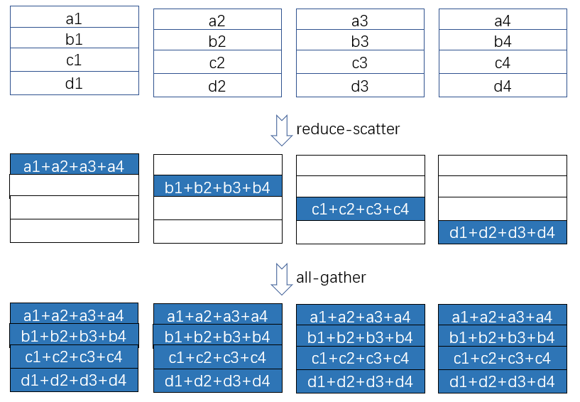 图 2:使用 reduce-scatter 和 all-gather 实现 all-reduce