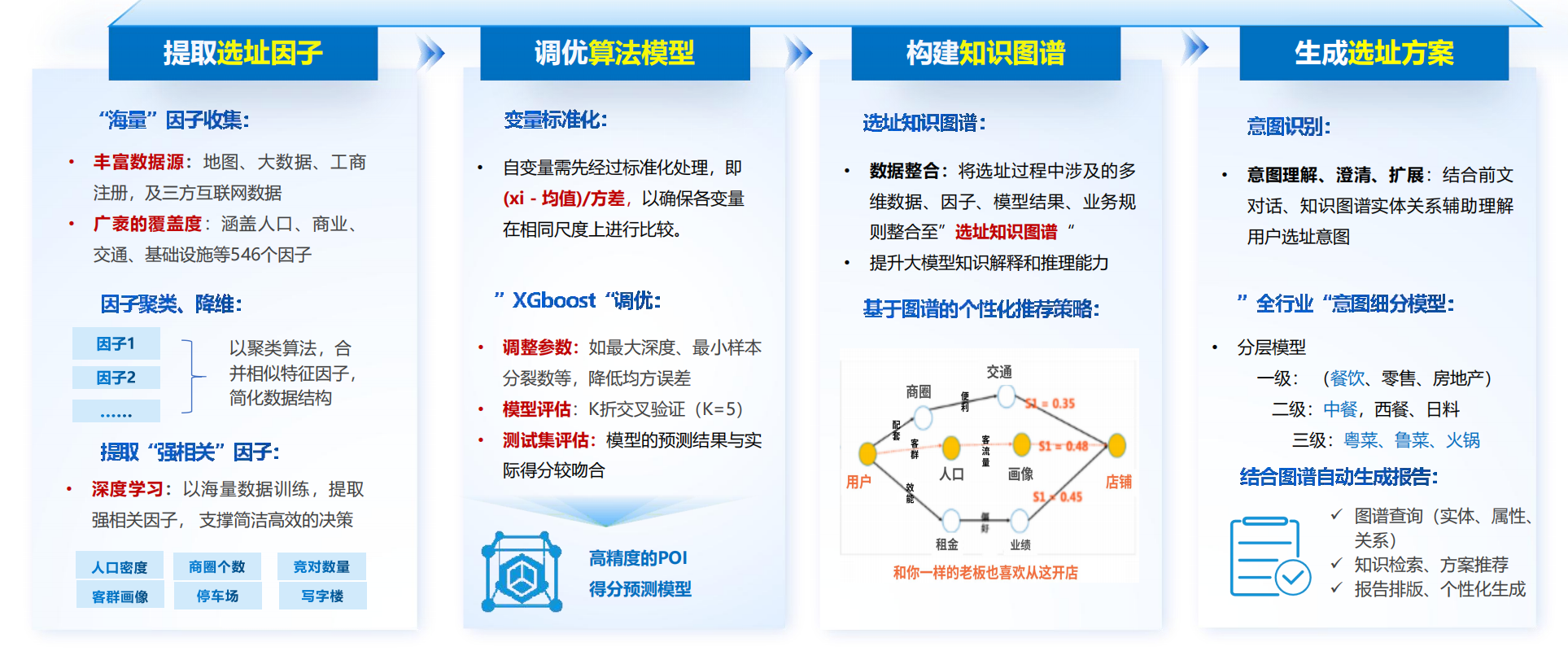 - 大模型组件:九天模型嵌入知识图谱(KG),用于多模态交互。输入为用户对话(如“餐饮店,预算5万/月,济南市中区”),输出意图向量(e.g., [行业:餐饮, 预算:5e4, 区域:lat=36.65,lon=117.0,r=5km])。KG增强解释性:实体(如“商圈”)链接关系(如“has_competitor”→“火锅店密度>3/km²”),通过SPARQL查询注入上下文,降低幻觉率至<5%。