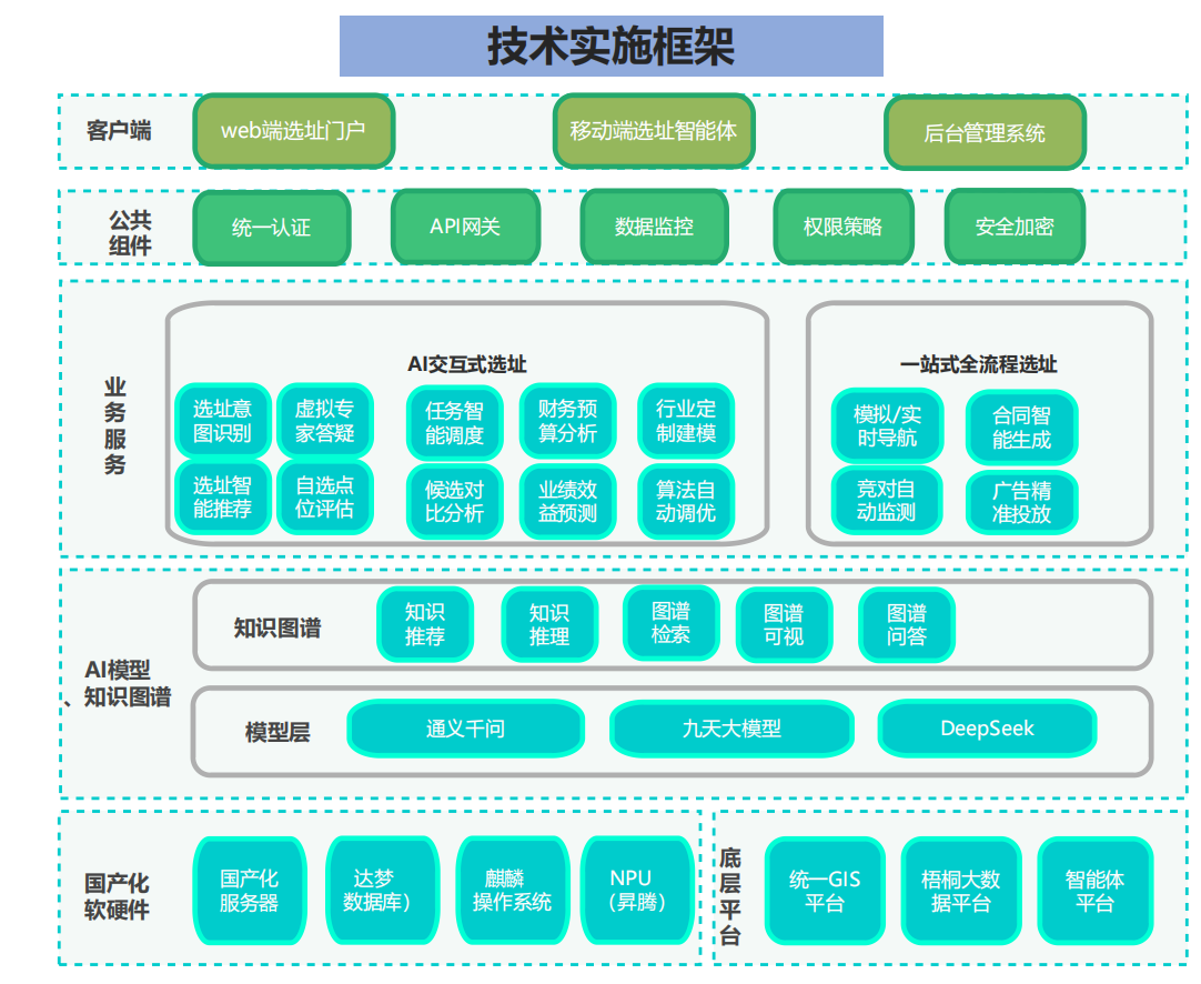架构采用微服务(Spring Cloud on 麒麟OS),公共组件(统一认证、API网关)确保安全(加密传输,权限RBAC)。任务调度用Airflow-like国产工具,端到端自动化:从周边调研(地图锁定→报告生成)到点位评估(自选AOI→打分雷达)。