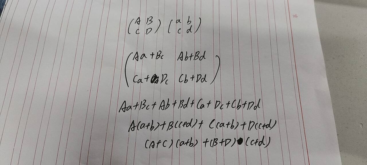 先看下图,我们就可以得到一个结论,就是A矩阵的第i列的和×B矩阵的第i行的和,i从第一行到最后一行遍历完,每个结果都相加,就可以得到最终结果