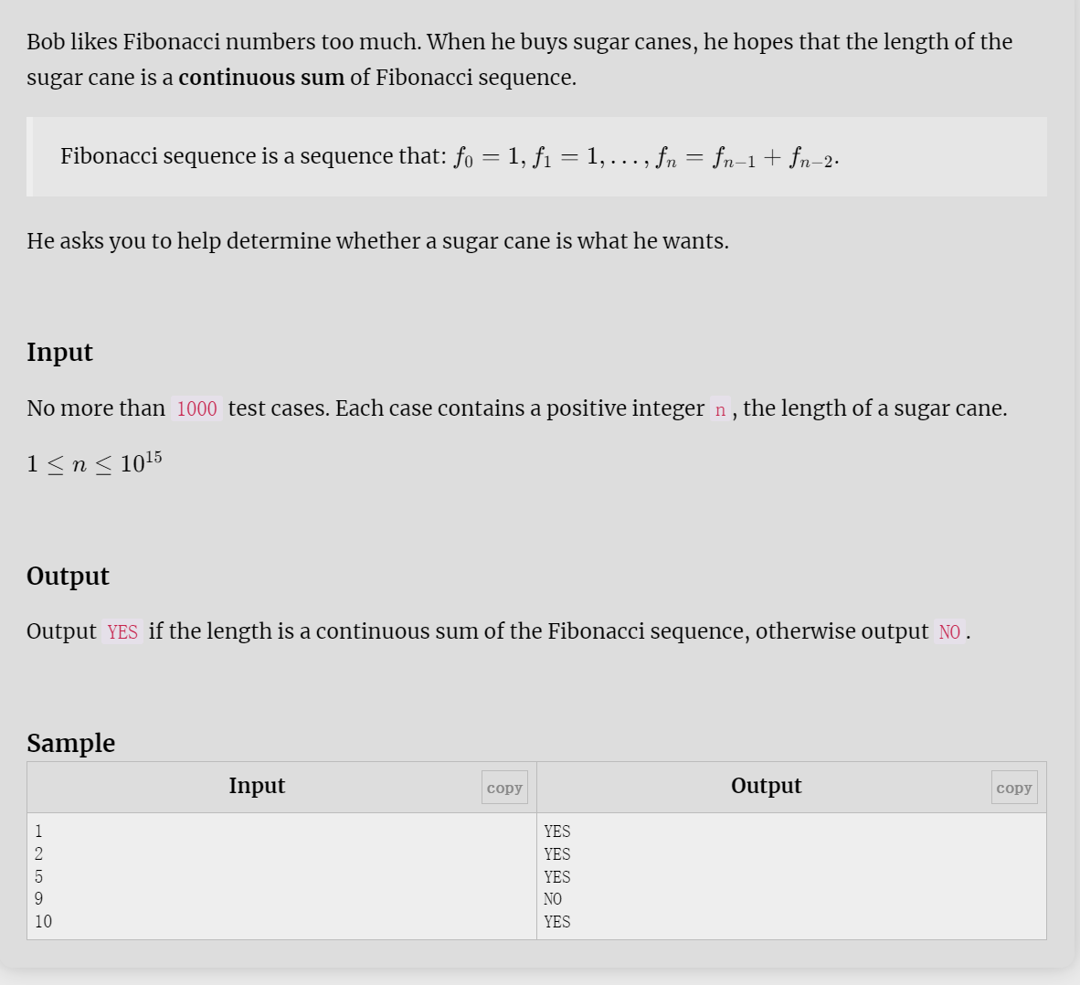 因为是模拟赛,就没有用翻译插件了,这题的题目意思其实很简单,就是有一个斐波纳契数列,然后从这个数列中截取一个连续的子数列,是否存在一段子数列可以等于输入的值,若不存在符合条件的子数列,则输出NO