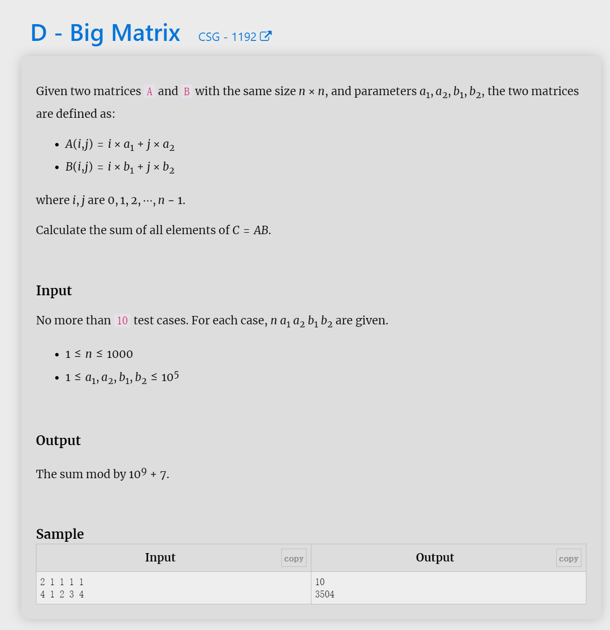 这题的题目很简单,就是A和B俩个矩阵都是 n * n 的矩阵,矩阵中的所有值就是A的所有可能值和B的所有可能值,然后将A,B俩个矩阵相乘,得到一个新的矩阵C,然后将C中的所有元素加起来的结果输出即可
