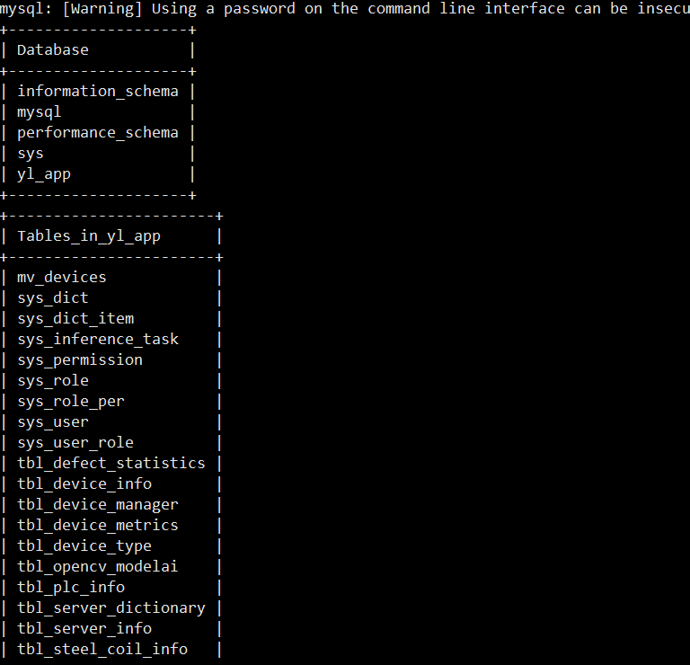 mysql -uroot -p123456 < /opt/yl_app.sql# 验证导入结果