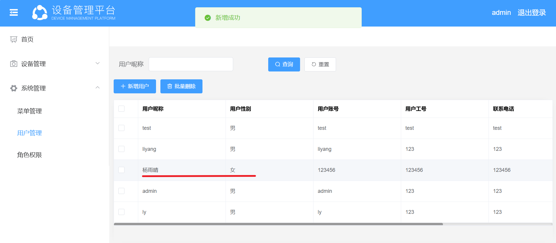 (nginx 节点 IP),预期跳转至 “设备管理平台” 登录页,使用账号(如 admin,默认密码 123456,文档中用户表含 yang/lyang 等账号)登录,可正常访问 “首页”“设备管理”“系统管理” 等菜单。