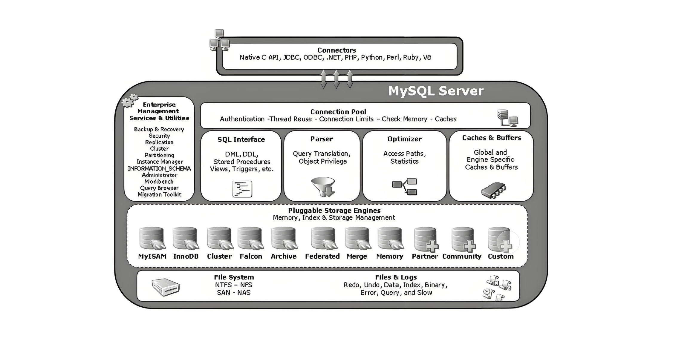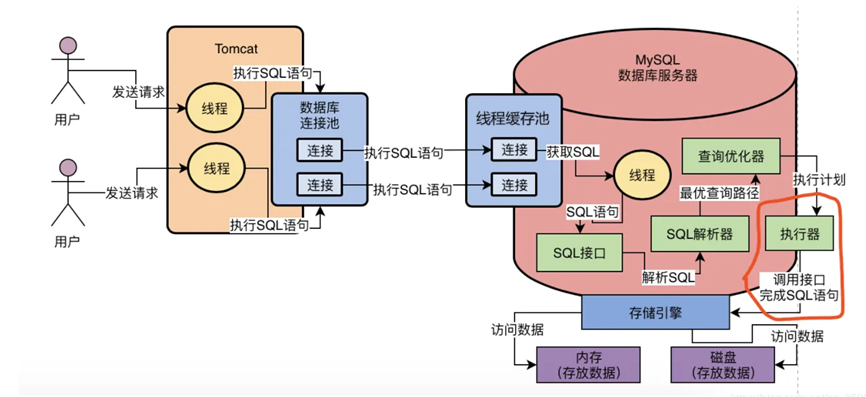 - **存储引擎 (Storage Engine)**存储引擎(如InnoDB)负责具体的数据存取操作。它先在内存缓冲池(Buffer Pool)中查找数据,没有则从磁盘读取,并将结果返回给执行器。