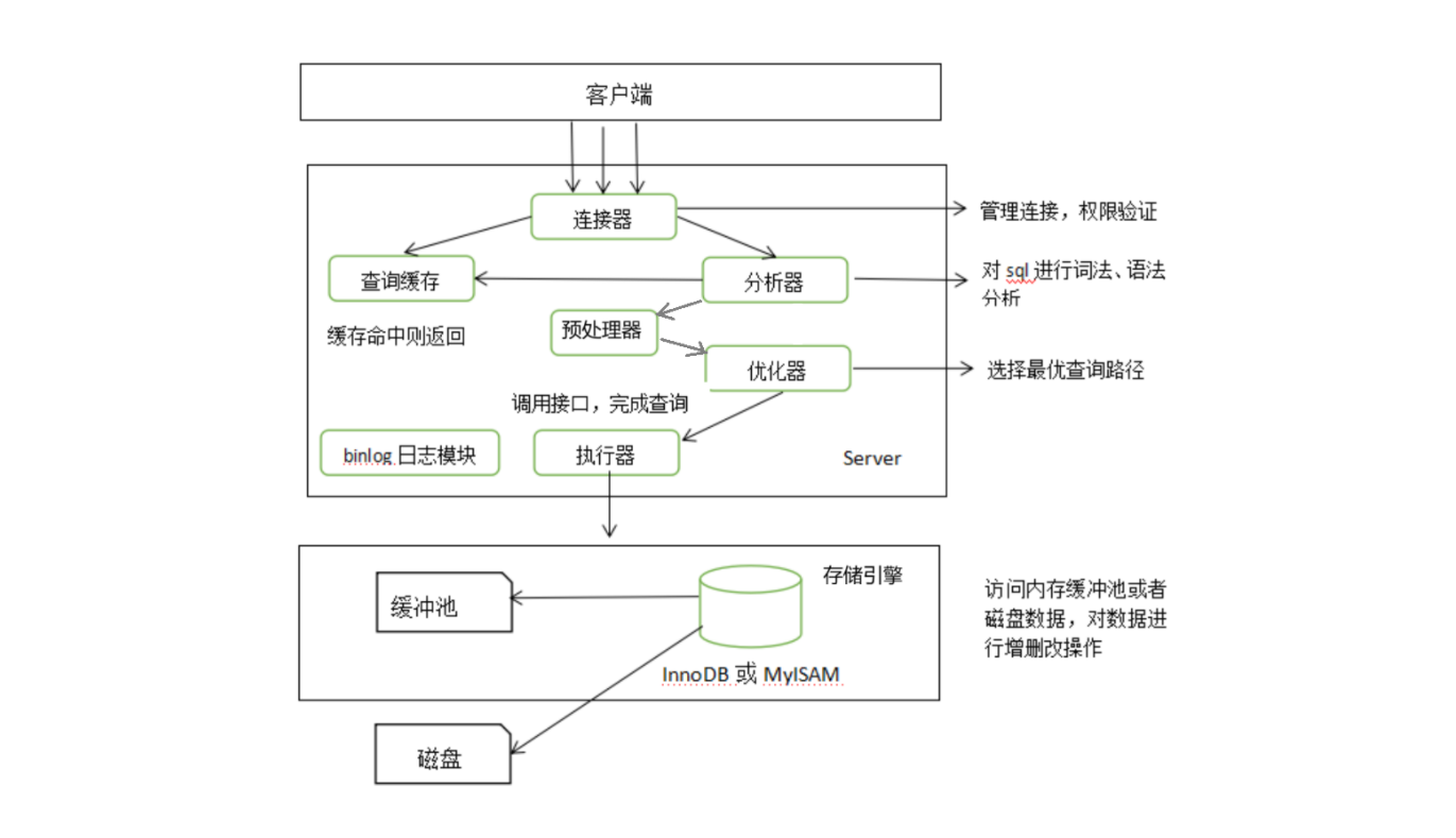 Server层包括连接器、查询缓存、分析器、预处理器、优化器、执行器、binlog日志模块(用于整个数据库操作记录,主从复制的关键)。