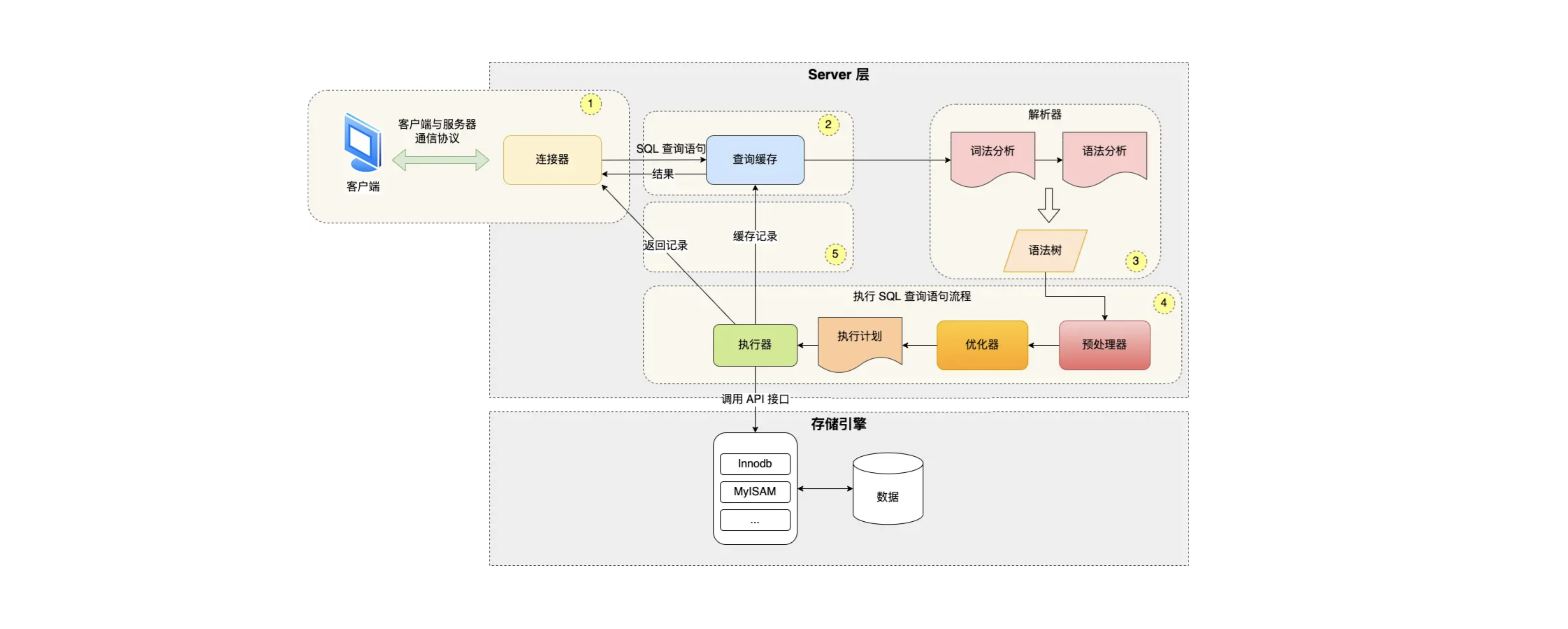 - 结果返回执行器将存储引擎返回的结果集进行处理(如计算、排序)后,返回给连接器,连接器返回给客户端。