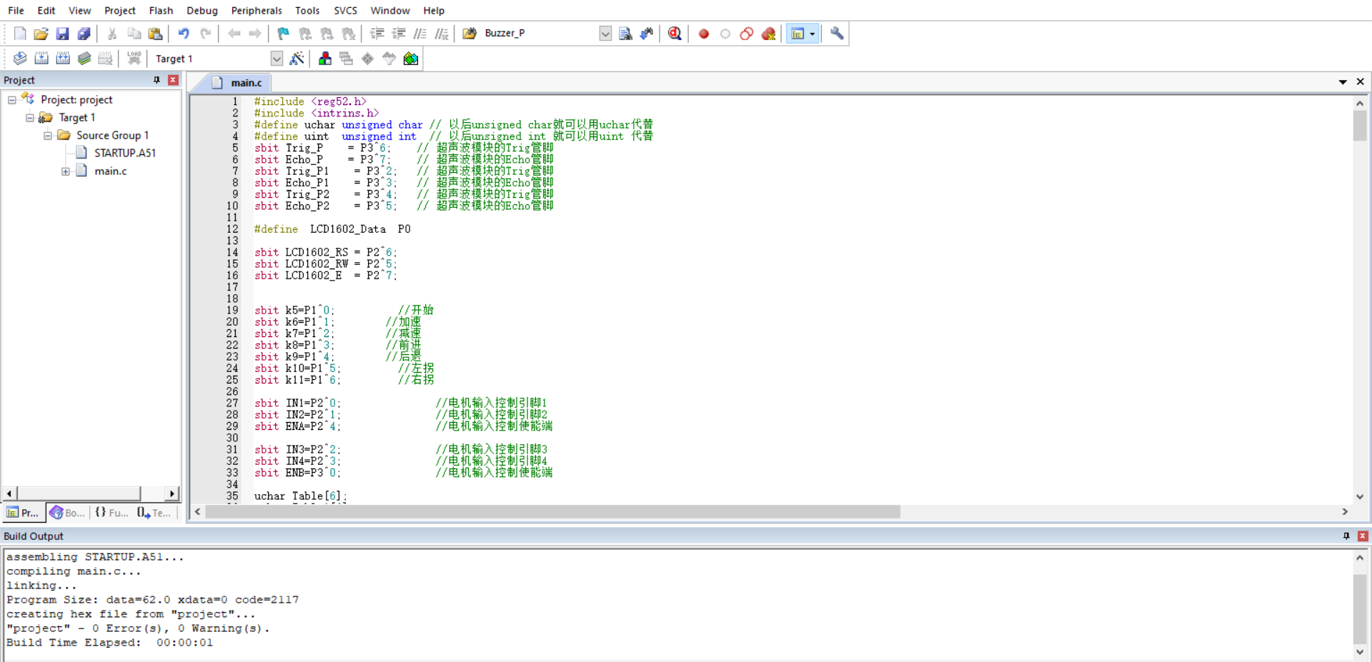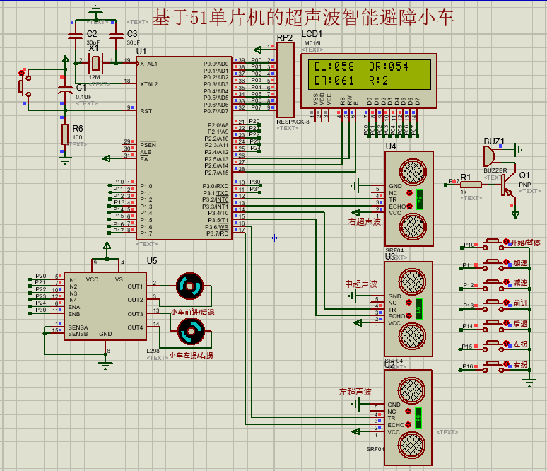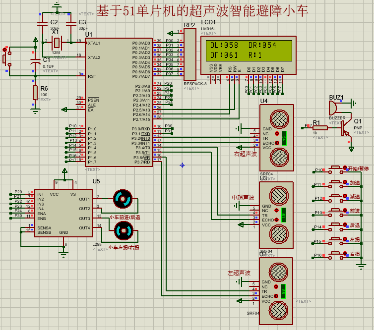 (3)利用三个超声波分别检测左中右的障碍物,当测得的障碍物距离小于50时,蜂鸣器报警,并减速。