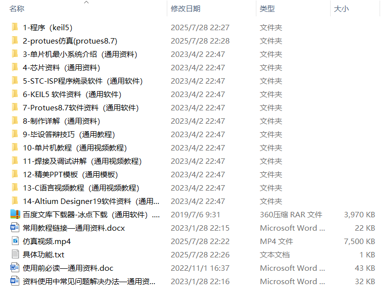 全部资料包括程序(keil5)、protues仿真(protues8.7)、设计说明、答辩PPT、开发资料、资料使用介绍、仿真视频、程序讲解视频、仿真讲解视频、最小系统介绍视频等。