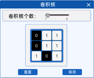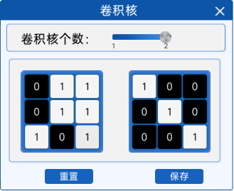 在“卷积核”组件中定义卷积核的内容,这里固定卷积核的大小为3x3, 除此之外还可以修改卷积核的个数及卷积核中每个值的大小(通过单击“格子”修改值)。