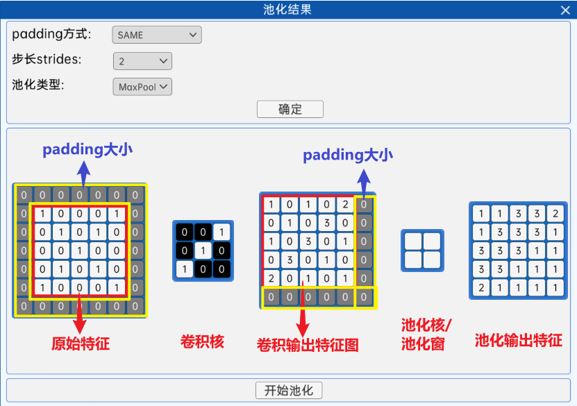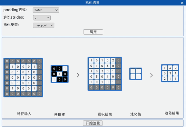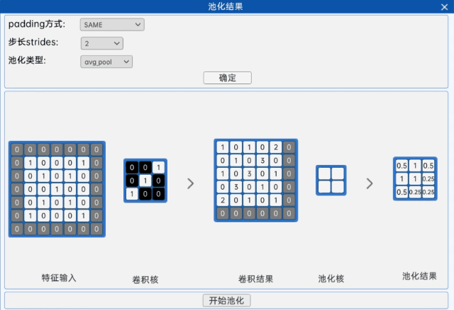 使用“池化结果”组件将卷积的结果进行池化操作,在该组件中,固定了池化核的大小为2x2,这也是极为常用的一个池化核大小的参数, 除此之外,可以在该组件中设置池化核的步长与Padding方式以及池化类型,一般情况下,池化核大小是2的情况下,步长一般也就是2,如下图所示: