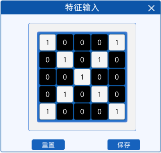 本实验中提供了一个5x5的特征输入矩阵,其中点击“格子”可以修改里面的值,仅限于0和1的切换,如下图所示: