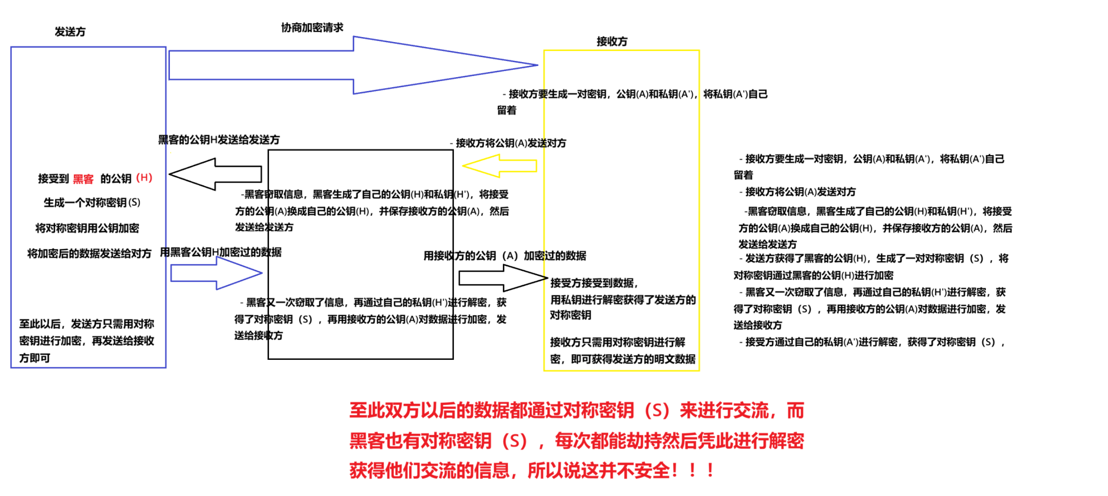 - 接受方通过自己的私钥(A')进行解密,获得了对称密钥(S),至此双方以后的数据都通过对称密钥(S)来进行交流,而黑客也有对称密钥(S),每次都能劫持然后凭此进行解密获得他们交流的信息,所以说这并不安全!!!