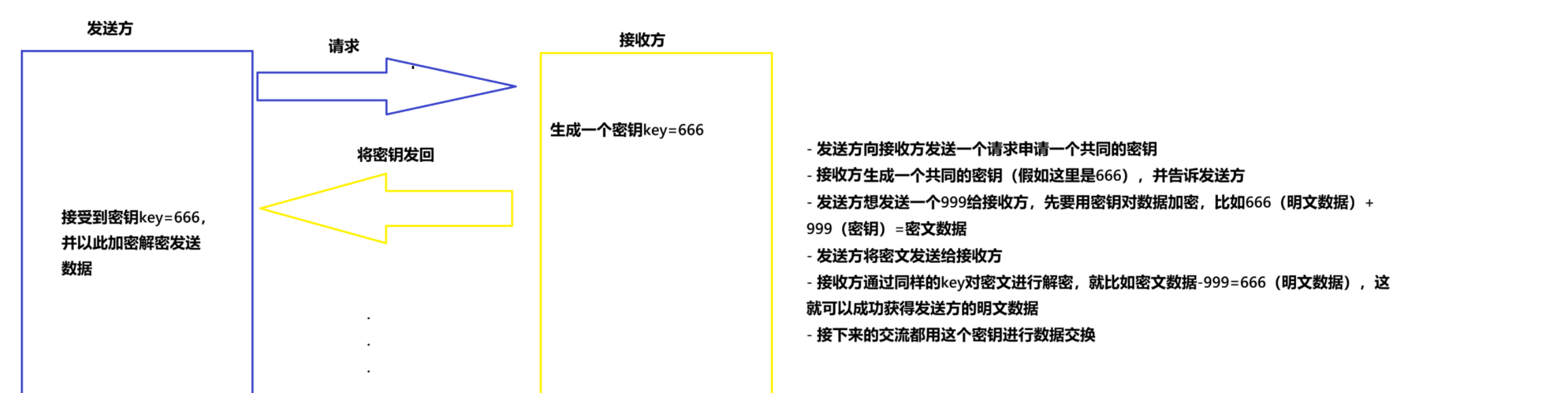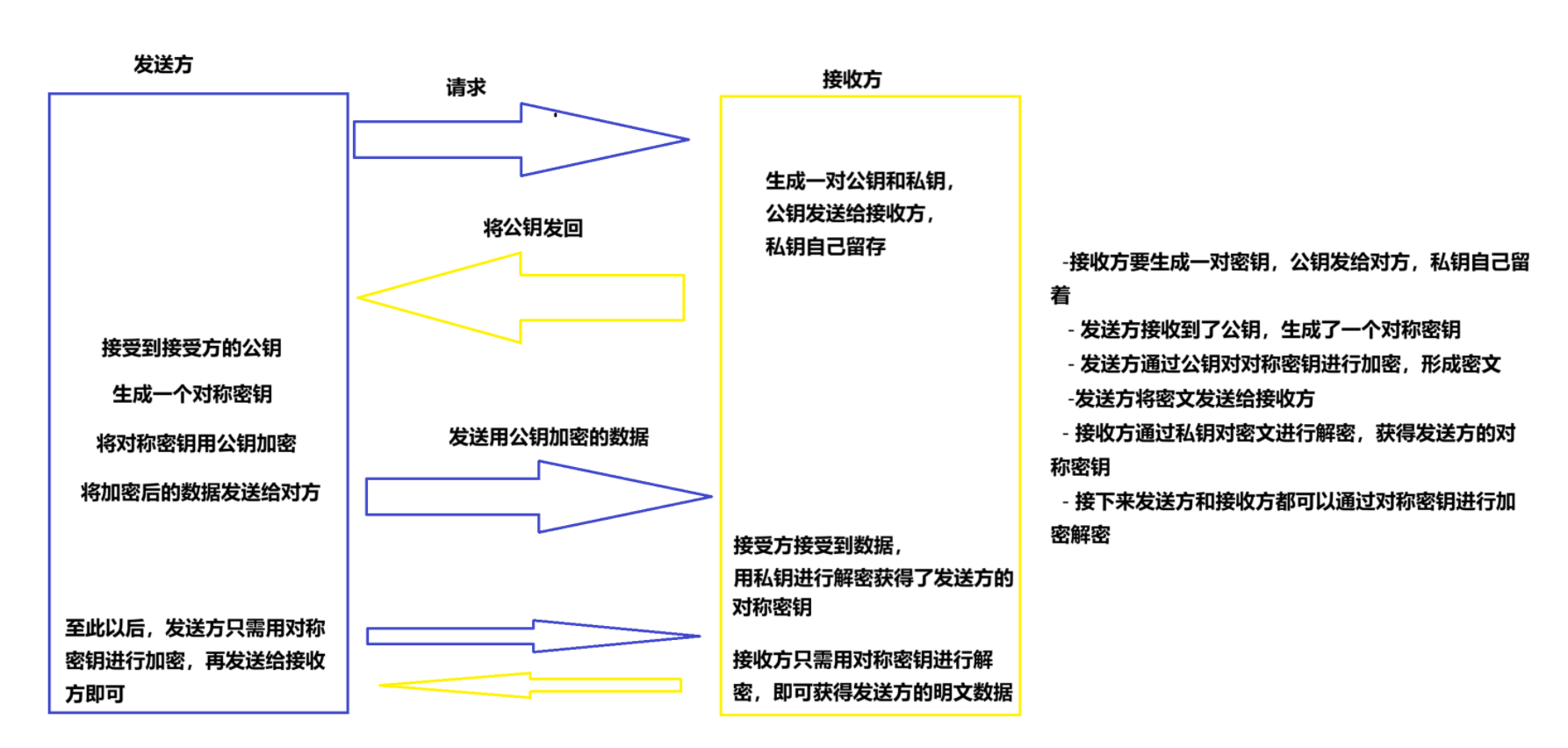 - 接下来发送方和接收方都可以通过对称密钥进行加密解密
