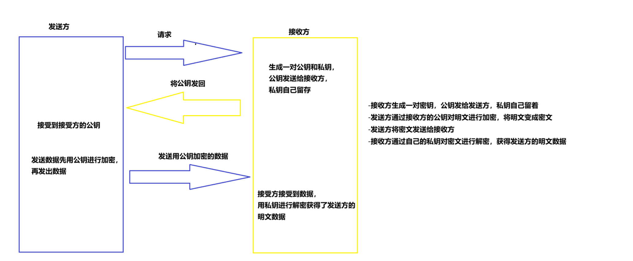 - 接收方生成一对密钥,公钥发给发送方,私钥自己留着