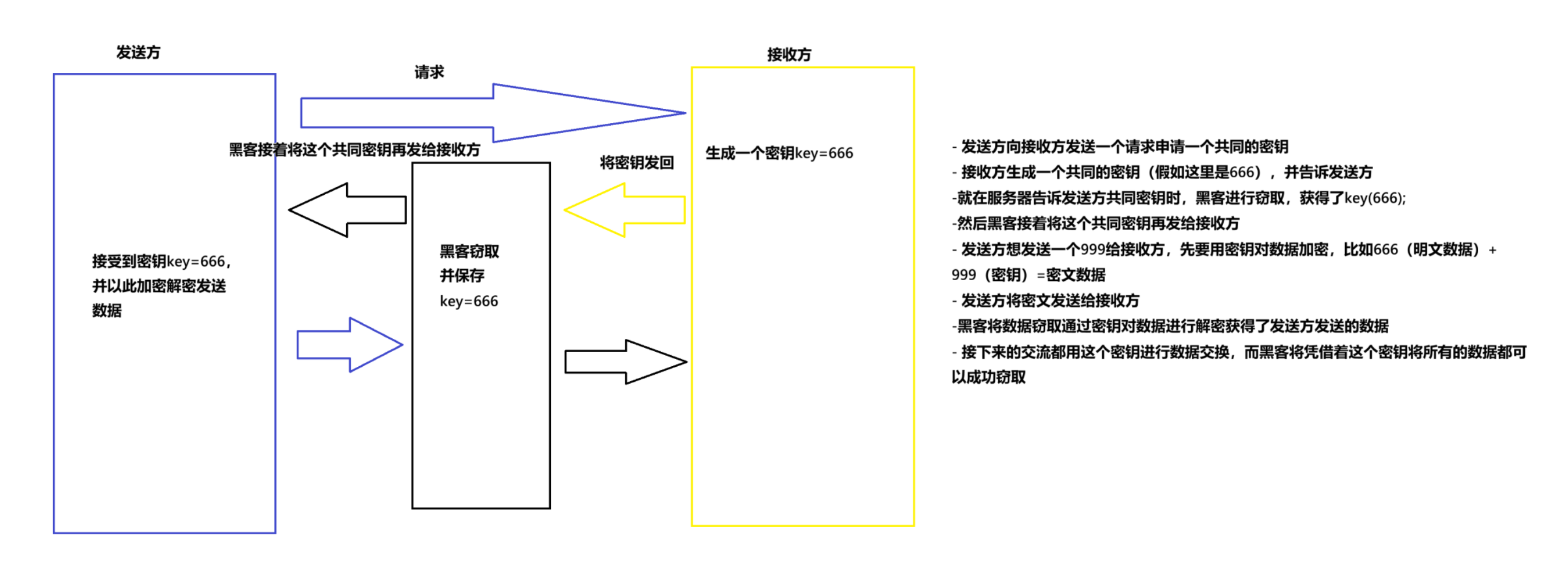 缺点:双方协商共同密钥的时候是明文数据,容易被黑客进行窃取,获得共同的密钥,进而在后面的发送方和接受方交换密文数据时可以随时解密获得明文数据。