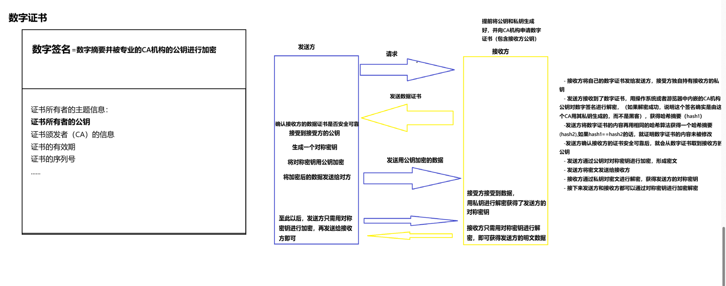 - 接收方将自己的数字证书发给发送方,接受方独自持有接收方的私钥