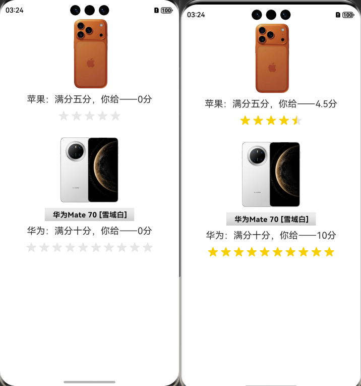 struct Index {// rating 用于存储当前评分值,初始化为3.5@Local fiveRating: number = 0;@Local tenRating: number = 0;// build方法是组件的UI构建入口,用于定义组件的布局和内容build() {// 外层Column布局:占满整个屏幕空间,作为根容器Column() {// 内层Column布局:设置固定宽高,用于容纳评分组件和文本显示Column({ space: 20 }) {Column({ space: 10 }) {Image($rawfile("pingguo.png")).width("50%")Text("苹果:满分五分,你给——" + this.fiveRating + "分").fontSize(20)Rating({ rating: this.fiveRating, indicator: false }).stars(5) // 设置评分星星的总数为5颗.stepSize(0.5) // 设置评分的步长为0.5,即每次可增减0.5分.onChange((value: number) => { // 评分变化时的回调事件this.fiveRating = value;})}Column({ space: 10 }) {Image($rawfile("huawei.jpg")).width("50%")Text("华为:满分十分,你给——" + this.tenRating + "分").fontSize(20)Rating({ rating: this.tenRating, indicator: false }).stars(10) // 设置评分星星的总数为5颗.stepSize(0.5) // 设置评分的步长为0.5,即每次可增减0.5分.onChange((value: number) => { // 评分变化时的回调事件this.tenRating = value;})}}}.width('100%') // 外层Column宽度占满父容器(屏幕).height('100%') // 外层Column高度占满父容器(屏幕)}
